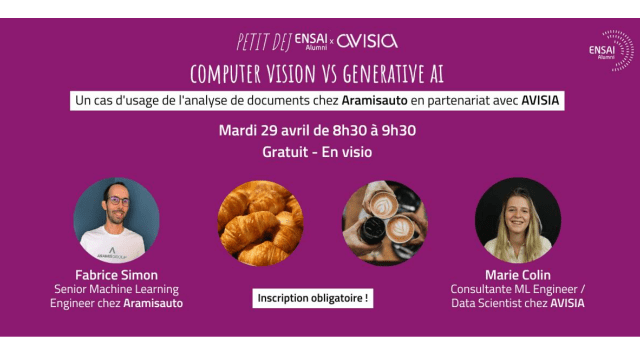 Pour ce deuxième petit-déjeuner, nous vous proposons avec notre partenaire AVISIA une intervention de Fabrice Simon (2011), Senior Machine Learning Engineer chez AramisGroup ainsi que Marie Colin (2024), consultant ML Engineer / Data Scientist chez AVISIA sur le thème "Computer vision vs Generative AI : un cas d'usage de l'analyse de documents chez Aramisauto".